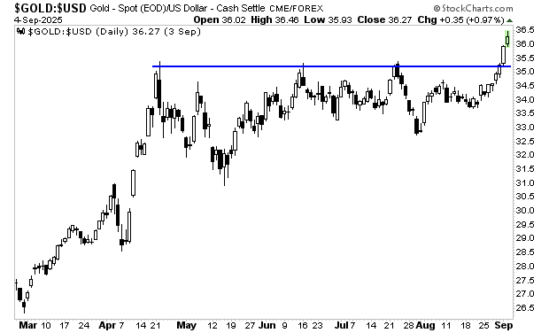 As I noted yesterday, gold is breaking out again. The precious metal, priced in dollars, erupted higher this week breaking out of a four month consolidation period.
