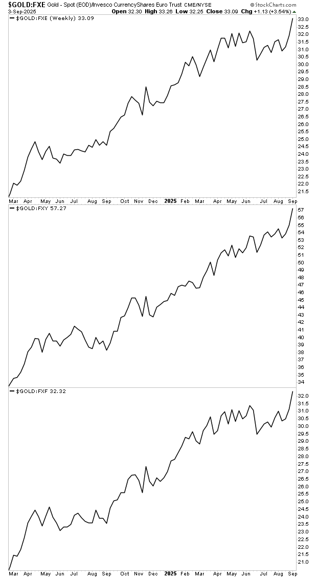 This phenomenon isn’t just about the $USD. Gold has also broken out to the upside against the Euro, Yen and Franc.